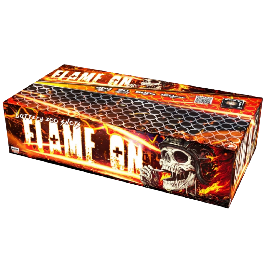 Kompaktný ohňostroj Flame On je sprevádzaný rôznymi viacfarebnými efektami. Tento ohňostroj vypáli do vzduchu 200 rán s veľkosťou ráže 14 mm s dĺžkou efektu 120 sekúnd.