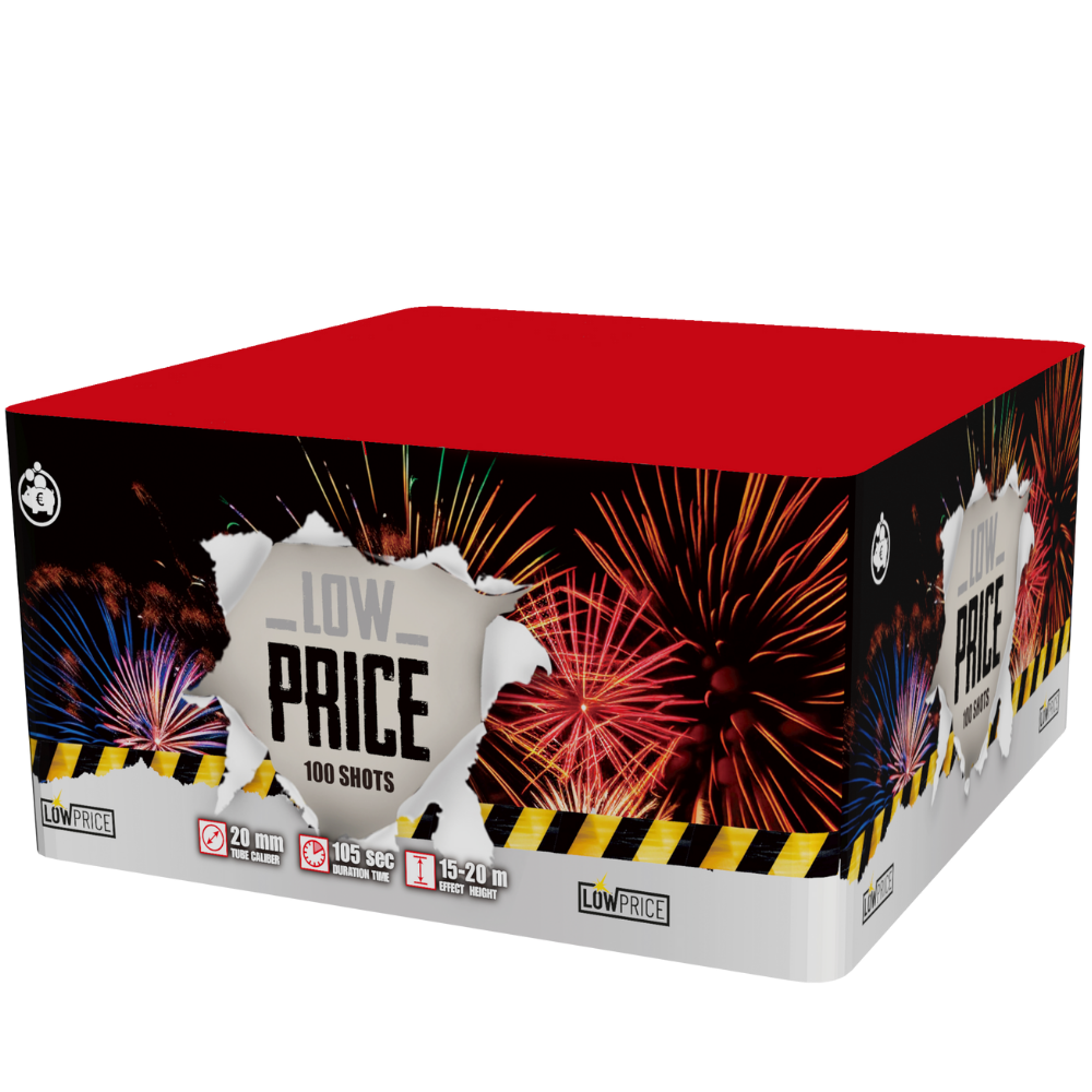 Kompaktný ohňostroj Low price je sprevádzaný rôznymi viacfarebnými efektami. Tento ohňostroj vypáli do vzduchu 100 rán ráže 20 mm a celá show trvá 105 sekúnd.