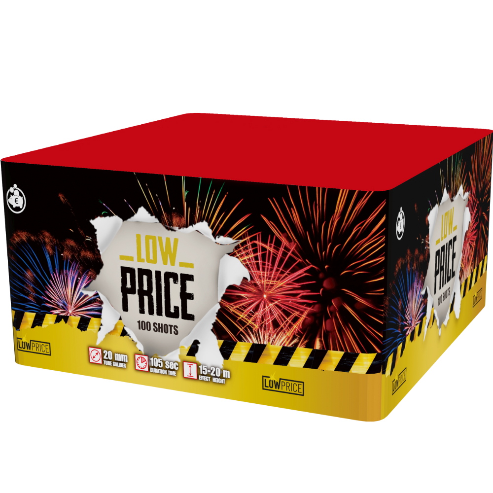 Kompaktný ohňostroj Low price je sprevádzaný rôznymi viacfarebnými efektami. Tento ohňostroj vypáli do vzduchu 100 rán ráže 20 mm a celá show trvá 105 sekúnd.