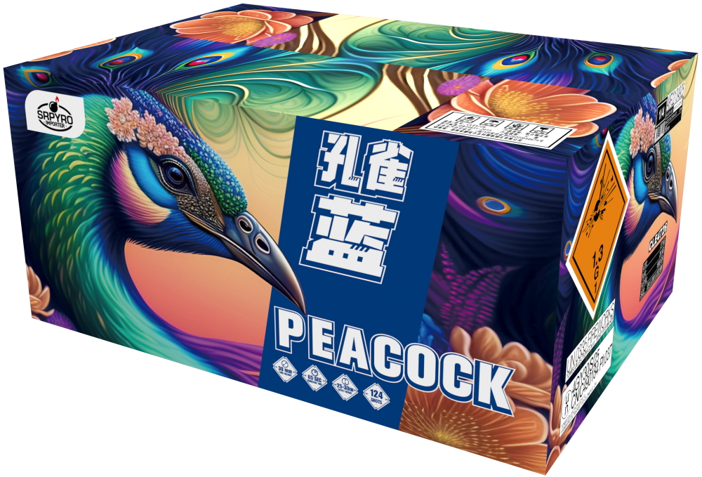 Kompaktný ohňostroj Peacock je sprevádzaný rôznymi viacfarebnými efektami. Tento ohňostroj vypáli do vzduchu 124 rán s veľkosťou ráže 30 mm s dĺžkou efektu 65 sekúnd.