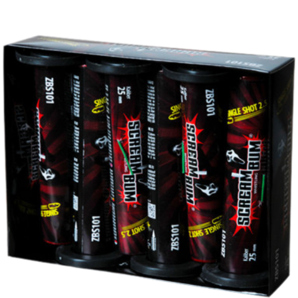 Jedno balenie obsahuje 6 kusoy zábavnej pyrotechniky Single shot Scream Bum Whistling. Tento Single Shot má priemer 25mm a do vzduchu vypáli silno hvízdavý zvuk.